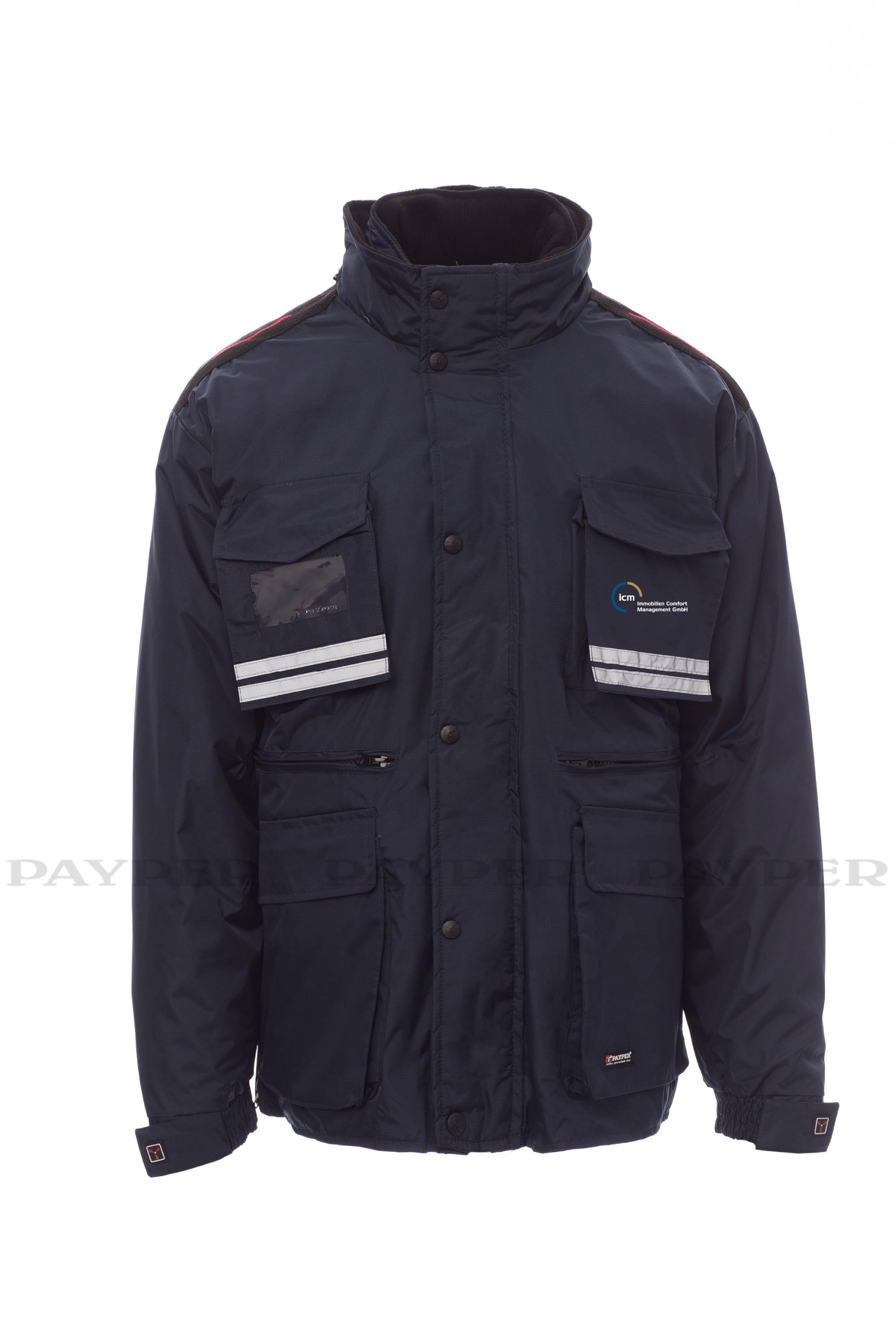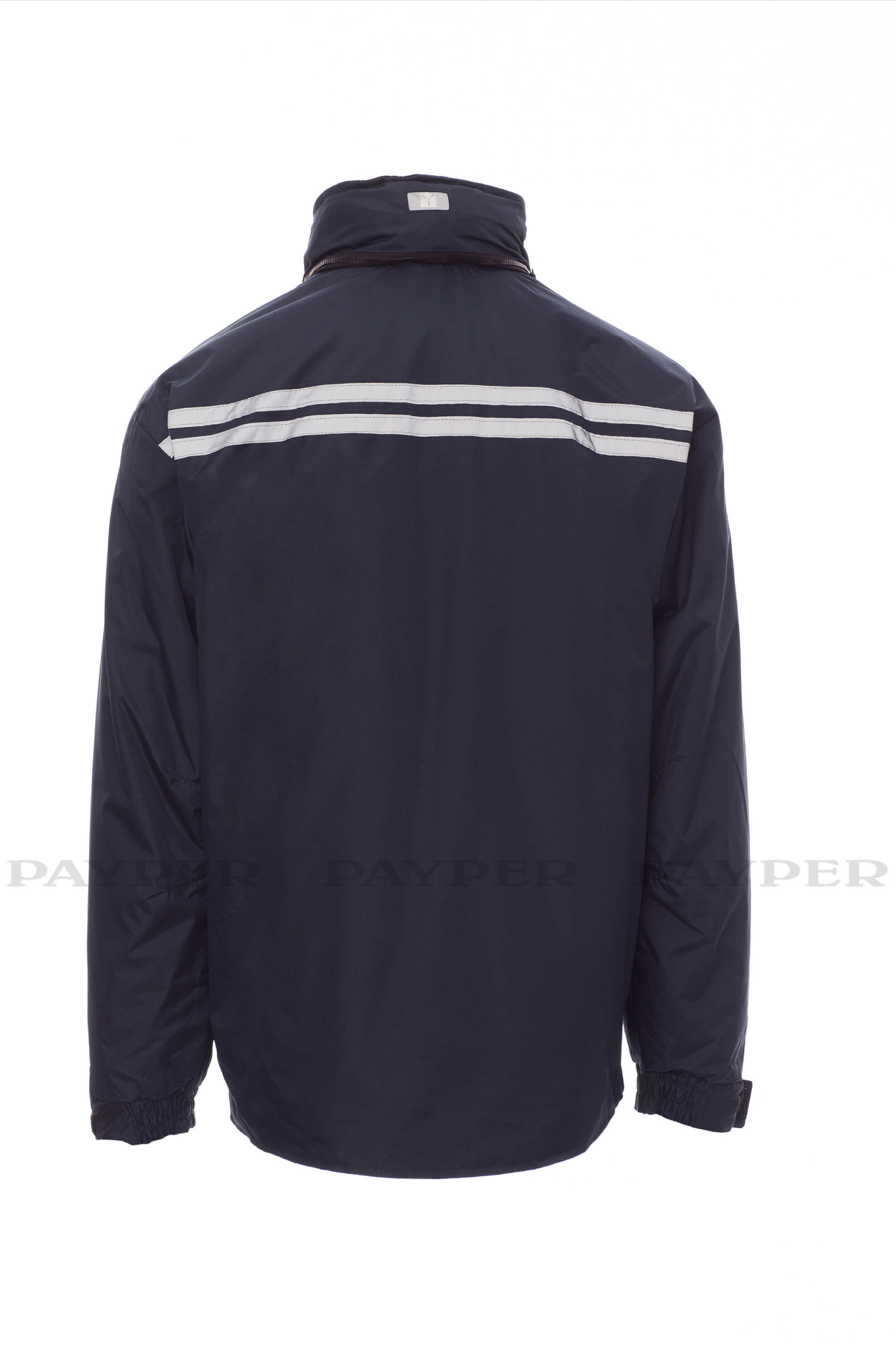 Vierfach nutzbarer Parka: nicht wattierter Außenjacke mit Nylonfutter, Kragen, Rückenpartie und Nierenwärmer aus Mikrofleece, atmungsaktive Einsätze unter den Armen, verdeckter 8 mm Reißverschluss aus Kunststoff mit Metallschieber und Kunststoffknöpfen, vorgeformte, abnehmbare oder im Kragen einrollbare Kapuze, regulierbare Ärmelbündchen, graue Reflexstreifen vorne und hinten, vorgeformte Ellbogen und Seitenschlitz mit Ziehharmonikafalte und Reißverschluss, 9 Außentaschen, davon 2 mit LOCK SYSTEM, 2 mit Reißverschluss und verstärkter Innenseite, 1 mit nach innen wendbarem Ausweisfach, Kordelzug in der Taille und Innenreißverschluss zum einfacheren Veredeln mit Druck und Stick. Wattierte Innenjacke, abtrennbare Ärmel, High-Density-Futter und Mikrofleece in der Rückenpartie, im Kragen einrollbare Kapuze, 5 Taschen, davon eine mit nach innen wendbarem Ausweisfach, Kragenverschluss, Reflex-Paspelierung an den Schultern und doppelte Reflexstreifen auf der Brusttasche und auf dem Rücken, Innenseite des Kragens aus Rippstrick, 1 Innentasche.