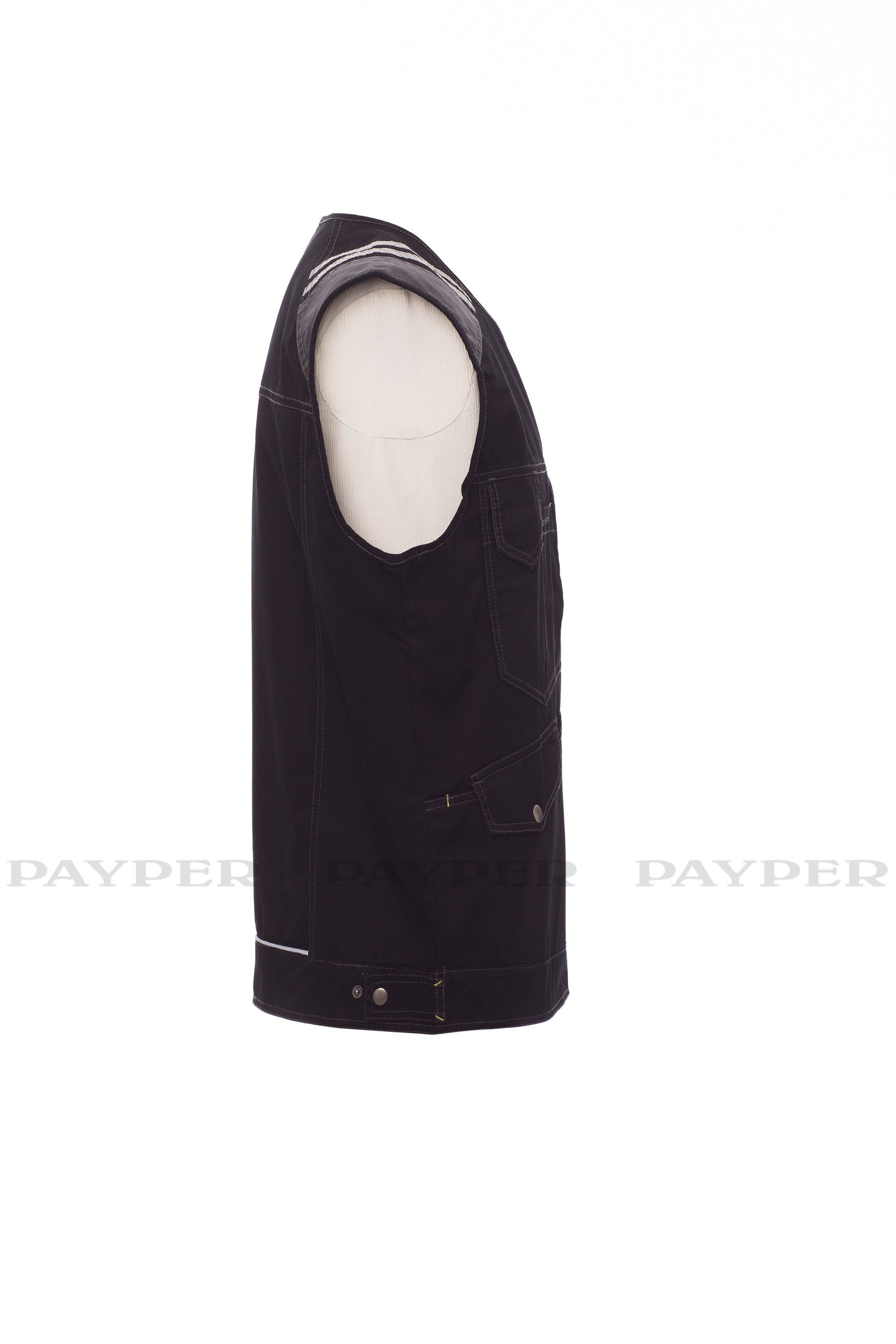 Zweifarbige Herren-Weste mit Reißverschluss aus Kunststoff, Weitenregulierung der Taille mit Knopf, drei Vordertaschen mit LOCK SYSTEM, davon zwei im Känguruschnitt mit Patte und Metallknopf, abtrennbarem und verschließbarem Ausweisfach, einer multifunktionalen Brusttasche, Reflexstreifen auf den Schultern, tailliertem Schnitt im Jeans-Design